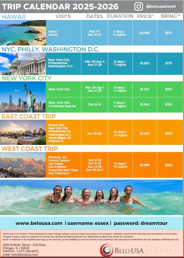 The cost of the trips are not included in the exchange and must be paid by the student’s natural parents. Students will get information, including loin and password to BeloUSA’s website at the Inbound Orientation in August.